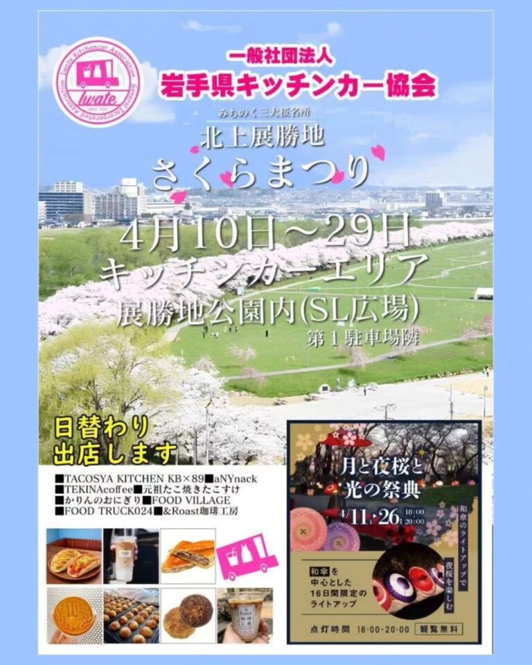 【北上展勝地さくらまつり、キッチンカーエリアのご案内です。】いよいよ明日10日より29日までの19日間、北上市では北上展勝地さくらまつりがスタート致します!今年のキッチンカーは鉄道が展示されているSL広場、桜並木通路にて日ごとに変わるキッチンカーが並 […]