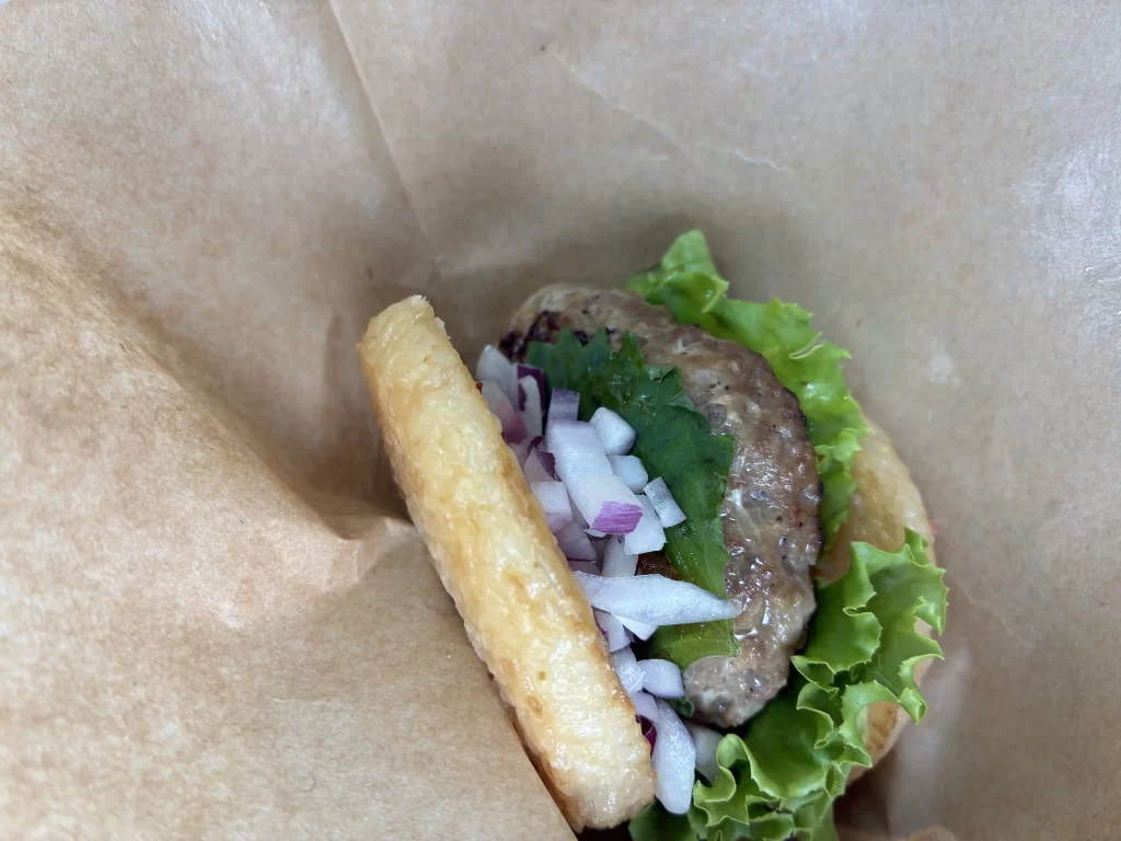 岩手県産の具材をカリッと焼いたライスバンズで挟んだ地産地消ライスバーガー